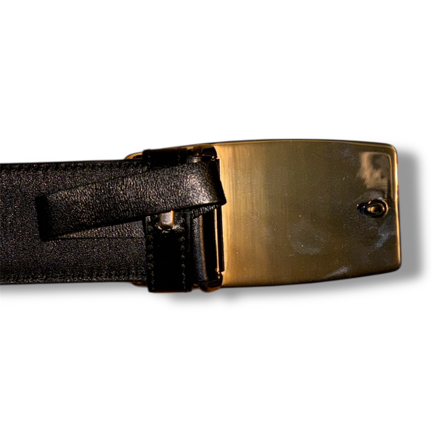 [] Men’s Prada black leather belt with gold tone steel belt buckle. 34 inch | 85 cm. Includes dustbag and original tag.